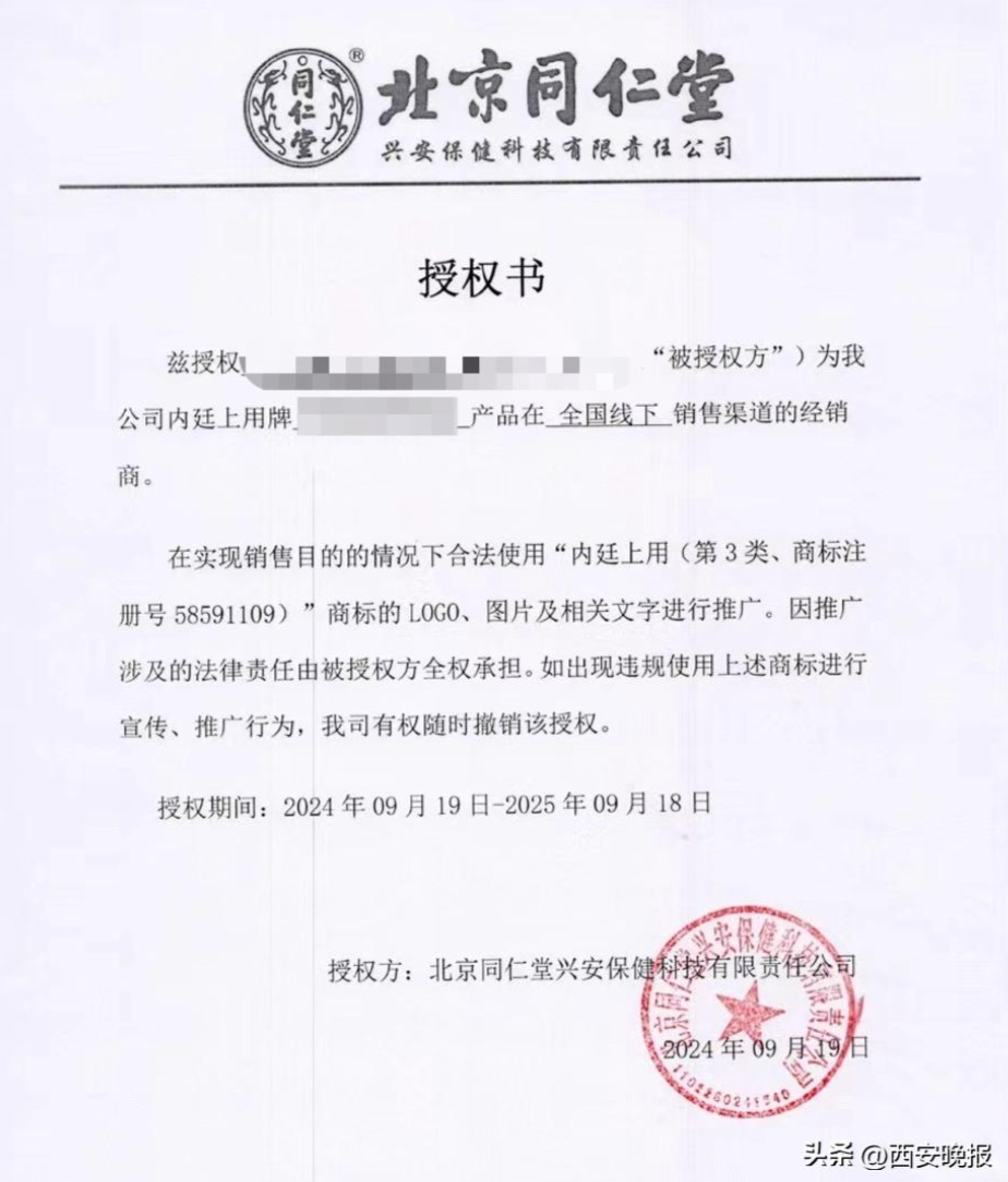 当被问及这类授权的真实性时,广东地区一名招商人员出示了一份北京同仁堂兴安保健授权某公司就“内廷上用牌xx膏”在全国线下渠道进行销售的授权书。授权书显示,可在实现销售目的的情况下合法使用“内廷上用(第3类、商标注册号58591109)”商标的LOGO、图片及相关文字进行推广。