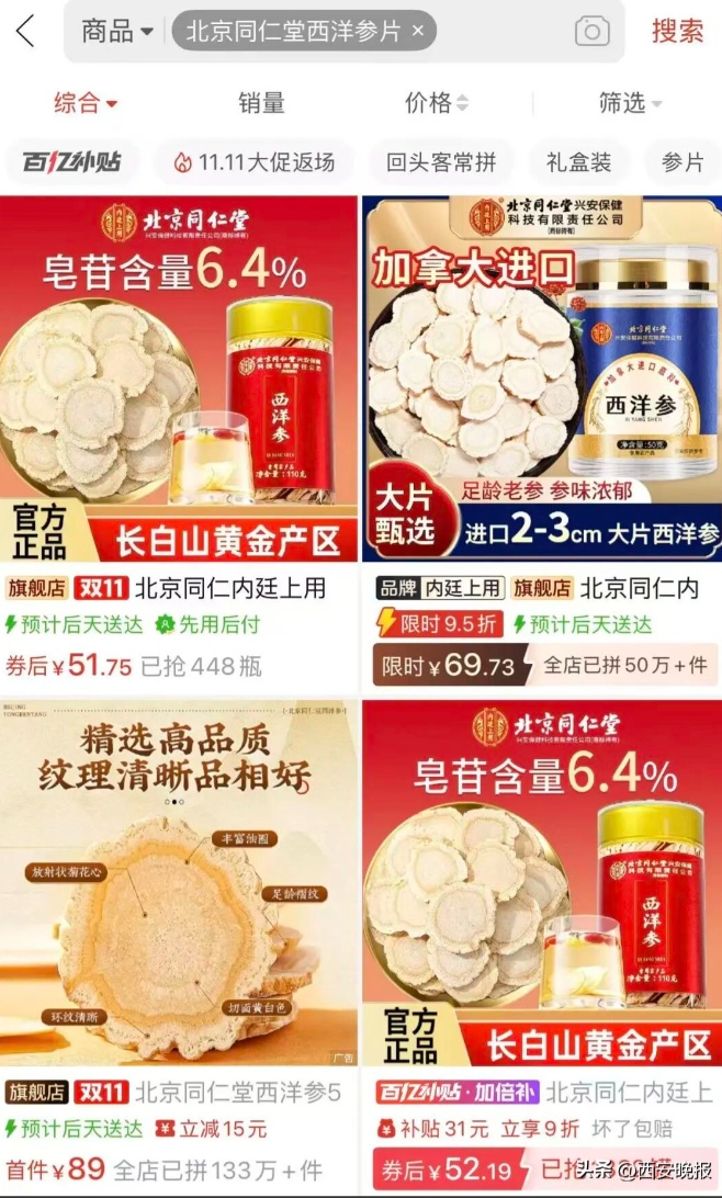 在拼多多上,销量排在首位的是“北京同仁堂兴安保健”出品的一款西洋参片,商家为“内廷上用健康旗舰店”,这款西洋参片外包装同样为红色瓶身,规格却是110g,单瓶价格为51.75元。销量排在第二的是一款蓝色瓶身、规格为50g的进口西洋参片,出品方同样为“北京同仁堂兴安保健”,商家为“内廷上用滋补养生旗舰店”,单瓶价格为73.4元。