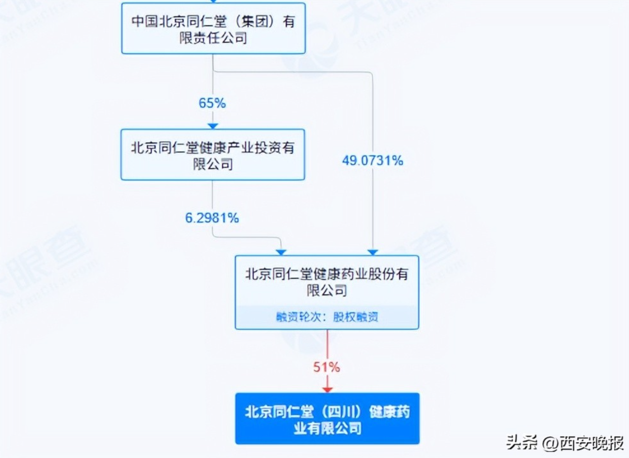 北京同仁堂(四川)药业的控股股东为北京同仁堂健康药业股份有限公司,持股比例51%,后者同样为北京同仁堂集团的孙公司。天眼查显示,目前北京同仁堂集团直接持股49.0731%,并通过北京同仁堂健康产业投资有限公司间接持股6.2981%。