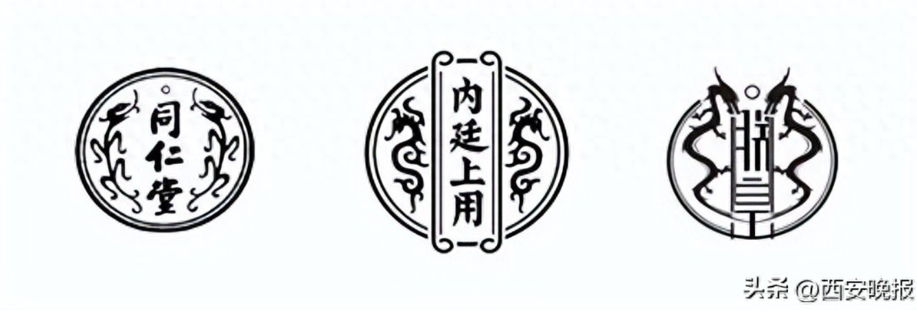 左:“同仁堂双龙商标”;中:“内廷上用”商标;右:“朕皇”商标。