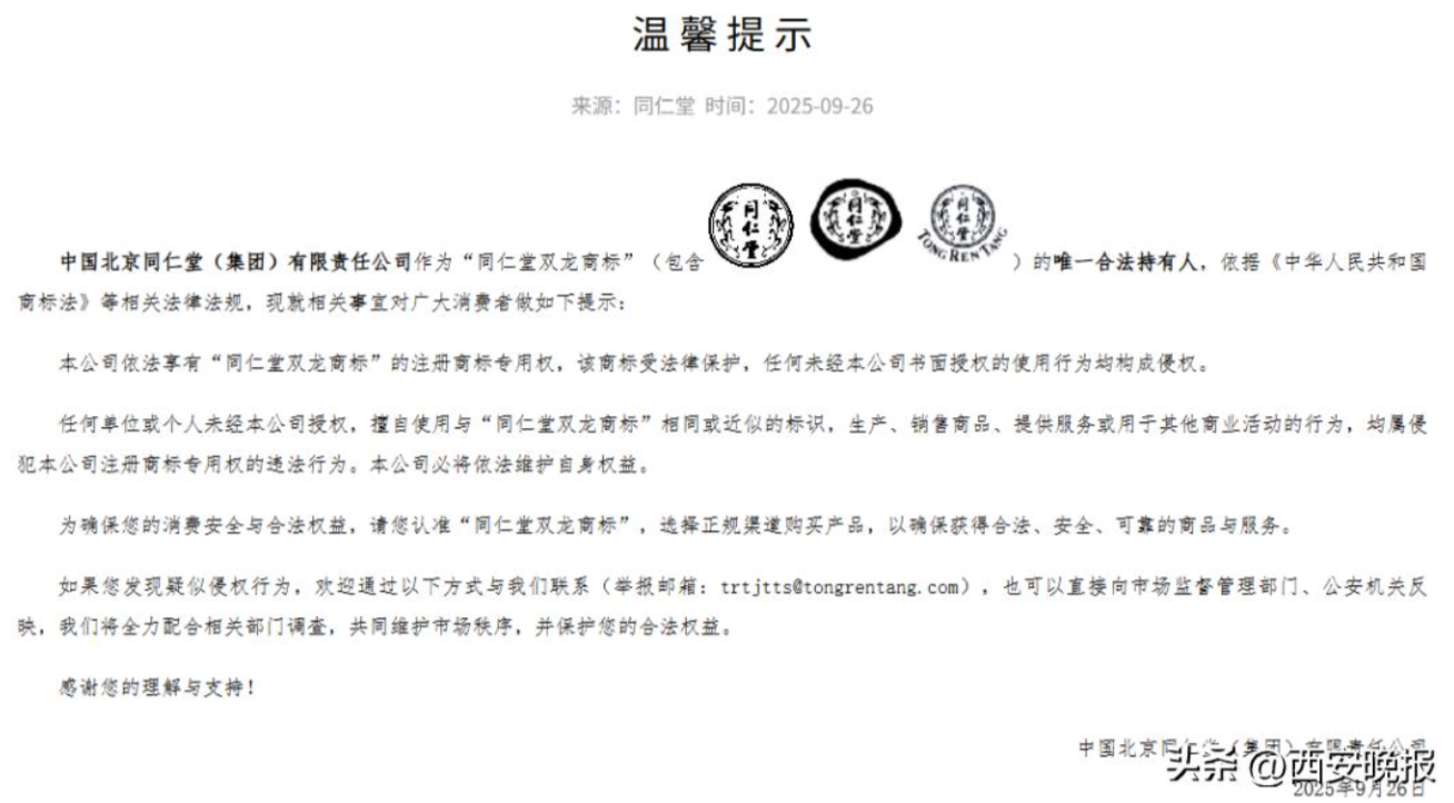 2024年8月,该集团发布声明称,“从未允许下属公司使用‘同仁堂’商标、字号及任何含有‘北京同仁堂’‘同仁堂’字样的标识,对外开展招商加盟活动,该类合作、加盟、宣传、销售行为均与我公司无关。”今年9月,该集团又提到其依法享有“同仁堂双龙商标”的注册商标专用权,任何未经授权擅自使用的行为均属于侵权行为。