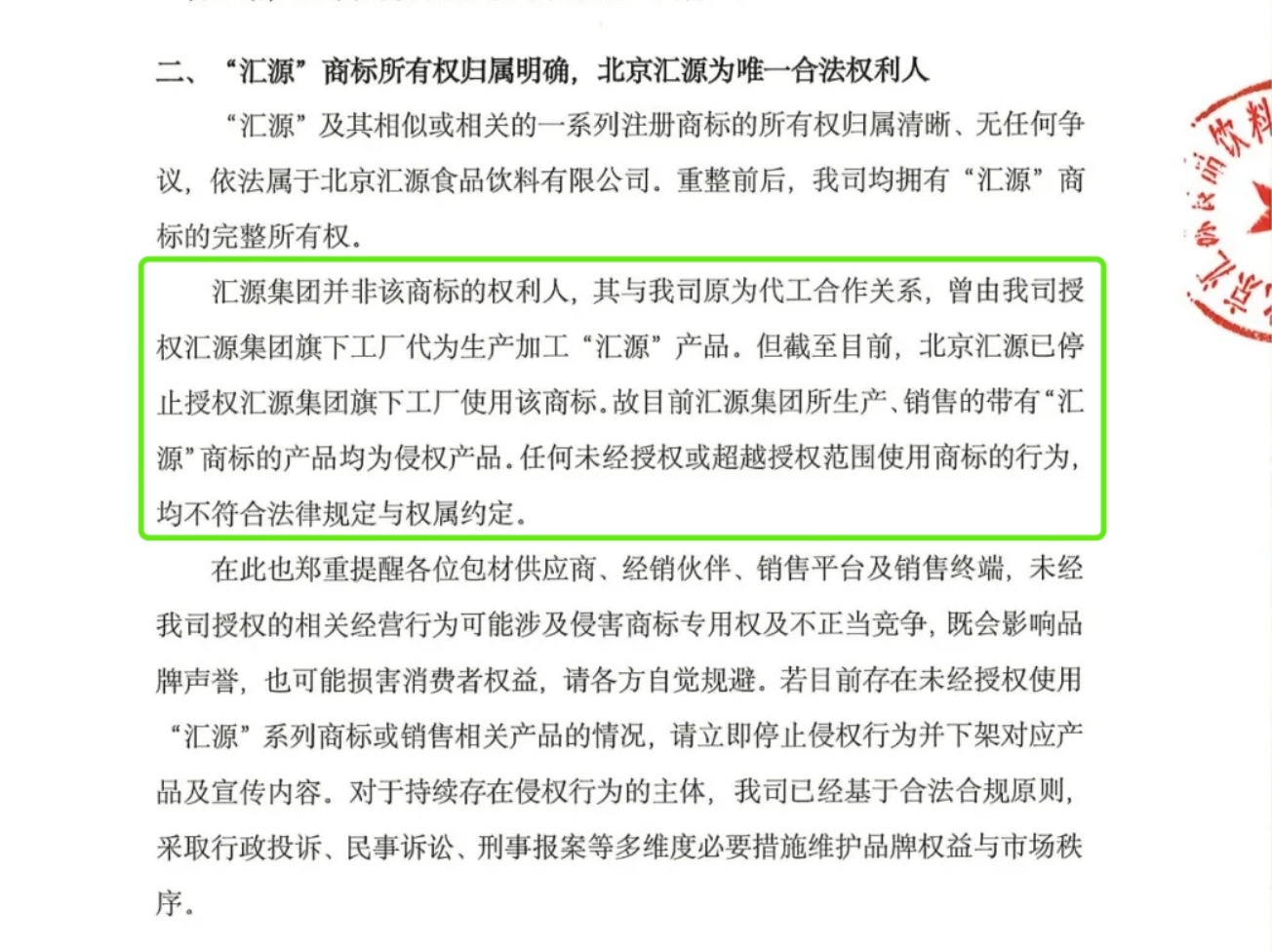 截至目前,北京汇源已停止授权汇源集团旗下工厂使用该商标。故北京汇源认为,目前汇源集团所生产、销售的带有“汇源”商标的产品均为侵权产品。