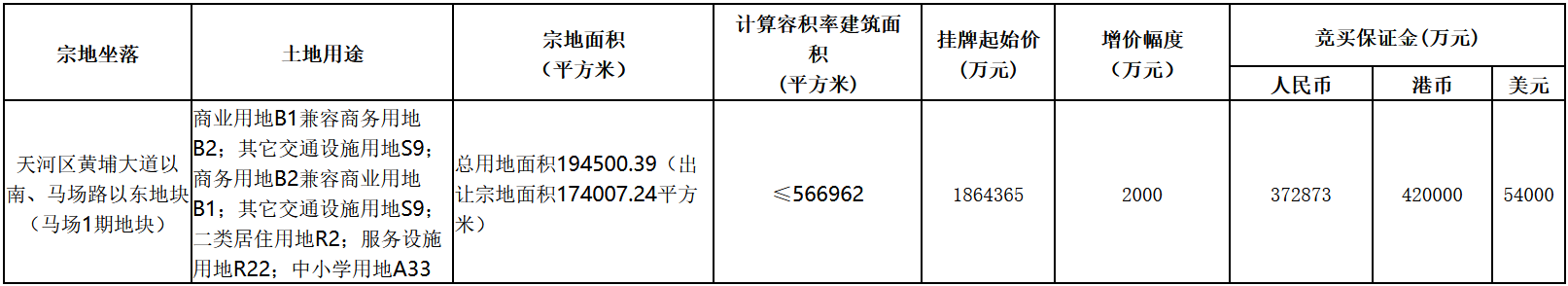 该地块坐落于天河区黄埔大道以南、马场路以东,总用地面积约19.45万平方米,出让宗地面积17.4万平方米,计容总建面56.7万平方米,涵盖二类居住用地(R2)、商业用地(B1)、商务用地(B2)及中小学用地(A33)等多种用地性质。