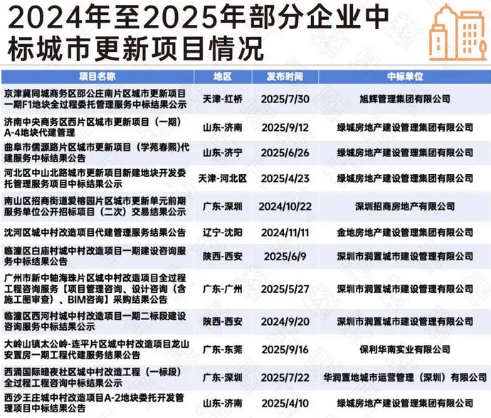(2024—2025年部分企业中标城市更新项目,图源:CRIC)